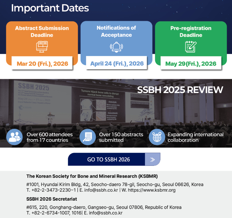 Go to SSBH 2026: https://ssbh2026.ksbmr.org/ Go to Abstract Submission: https://ssbh2026.ksbmr.org/abstract/index.php Go to Seoul Promotional Video: https://ssbh2026.ksbmr.org/about/seoul.php |